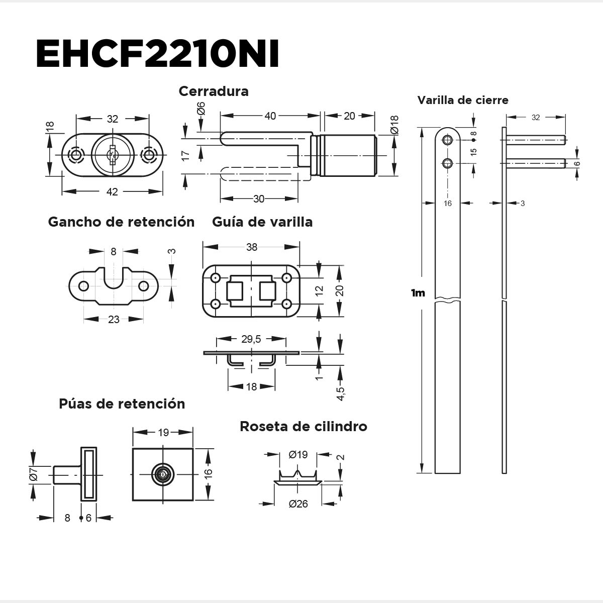 Cerradura Varilla Frontal 1000mm Ø19 Niquel