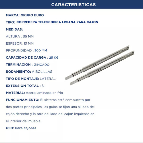 Correderas Telescopicas 30cm Slim 25kg Ziincado Grupo Euro